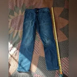 These D.Jean Straight Cut Jeans are in good used condition. Color has a desirable, uneven fade as great jeans should. No rips, fraying, tears, or stains. Button with zipper closure. Usable front pockets with side rivets. Rear usable pockets come with decorative beading. Pants have a cute eclectic style, and are made from a durable weighty denim with nice give and stretch for a curvy look.