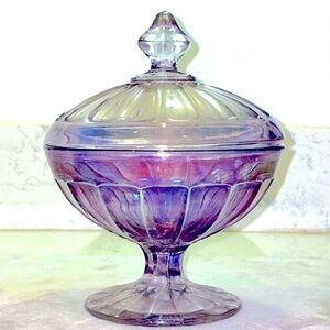 Antique Carnival Glass Covered Candy Jar Clear Amethyst Iridescent Signed Heisey