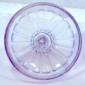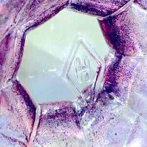Antique Heisey Carnival Glass Rare extra wide Covered Candy Jar. The candy jar is a very early example of Carnival Glass from 1923. The Candy Jar is Clear Amethyst With stunning purple Iridescence. The candy jar is signed Heisey on the bottom. The listing includes the candy jar and the lid. The cover has a very fancy cut glass finial. The candy jar is 7 1/4 inches tall and 5 3/8 inches wide. The candy jar and lid are in excellent condition.