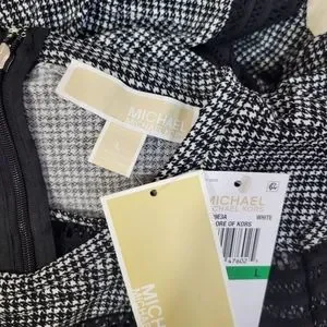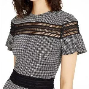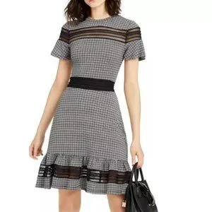 Michael Michael Kors checkered dress with mesh insets and a ruffled hem is the perfect piece to jazz up your wardrobe pieces for a night out on the town.
