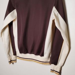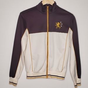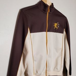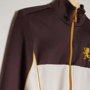 Y2k athletic / hc scene-style jacket with brown and cream colored body and yellow/goldenrod colored zipper. Jacket has lion and star embroidered detail on right side of chest, and striped elastic bands on sleeve cuffs and bottom band.