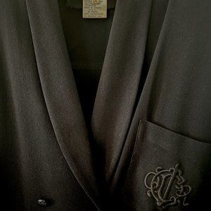 black shawl collared, pleated accents, pockets with CD monogram on breast pocket, triacetate and rayon, detachable shoulder pads, French cuffs (cufflinks not included), size 14 listed as L, 40” length from waist to hem, 30” inseam, 20” leg hem opening, 35” waist