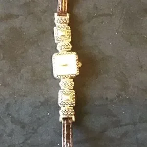 Women’s Geneva Elite Silver/Brown-leather band, stainless steal back, 9 inch band, new battery.