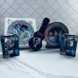 Elvis Bundle: Pez Tin, Jewel of Vegas Plate, 2 Ornaments, Tin