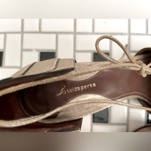 Totally unique, vintage-inspired peep toe heels from Luiza Perea for Anthropologie. Soft, buttery silver leather, beautiful art deco design, special ankle tie detail. Great low heel for dancing, standing and walking comfortably. Low heel also adds to their vintage style.