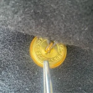 See close up of button hole on one lapel with some loose thread.