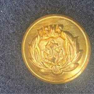8 gold tone buttons marked "USMS" for United States Maritime Service. Buttons have an anchor with the laurel wreath. Buttons made by Waterbury Button Co. in Connecticut.