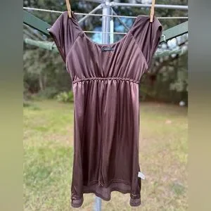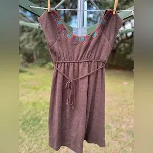 Theme brown, wool blend dress. Perfectly soft and satin lined. Beautiful embroidered rounded neckline. Perfect for cold months and paired with your favorite boots.