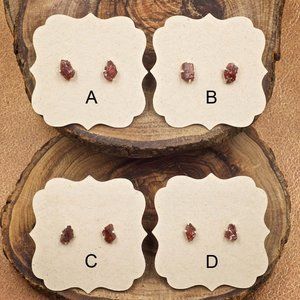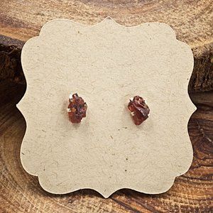 These rough Crystal Earrings are made of natural Garnet and are prong set in Sterling Silver. Each pair of Earrings come carded with Sterling Silver Butterfly Backs and Silicone push backs.