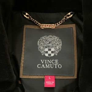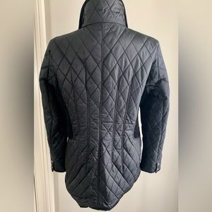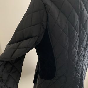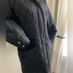 Black quilted nylon with black velvet inserts on collar, hem, cuff, pockets and sides. Gold hardware, 4 pockets. 30” collar to hem.