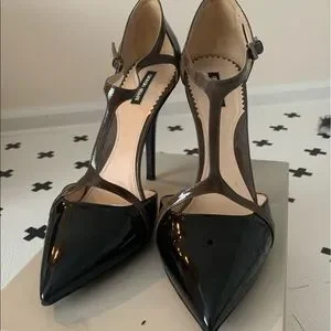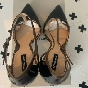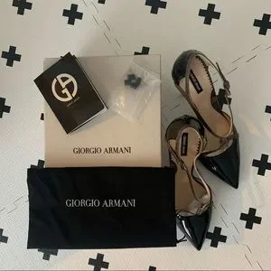 Gorgeous patent leather heels from Giorgio Armani in pristine condition. Size 40 IT corresponds to my size 9 US. Surprisingly comfy despite the high heel. Comes in original box, dust bag, passport and extra heel toppers. Inquire with questions within. I wore them twice to holiday outings and every time they were an absolute HIT!