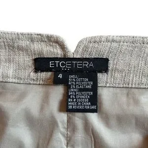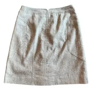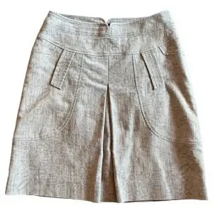 Women's 4 Etcetera Tan Pencil Skirt. Unique leopard print undertone design with cream and tan colors. Front middle pleat. Faux front pockets Side zipper. V on front and back waistband. Interior lining. Adorable business casual skirt for work.