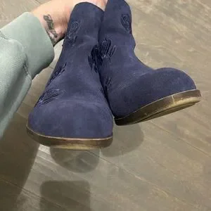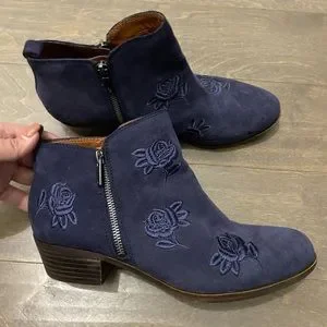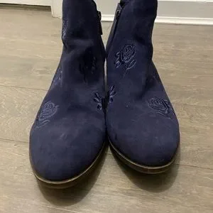 Lucky Brand Navy Blue Embroidered Basal Ankle Boots size 10. New condition, only tried on. There’s a tiny spot one of the toes which may be able to be removed with leather cleaner. Embroidered roses & two working zippers on each side. No Box.