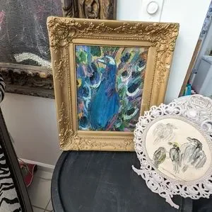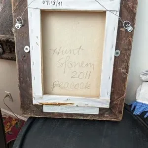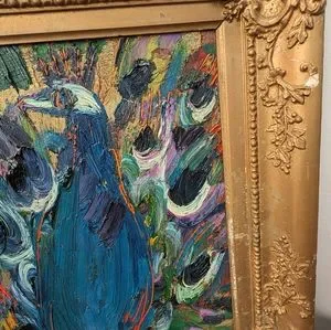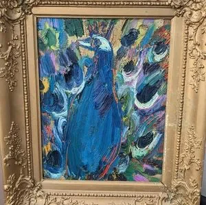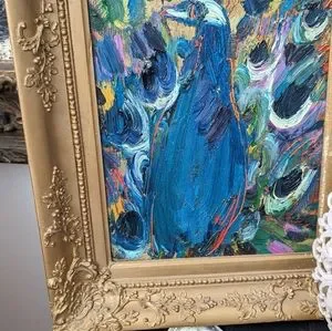 Amazing splashes of color by world renowned Neo-impressionist painter Hunt Slonem. The Peacock is a vibrant and eye-catching work of art which will always bring joy to your home and heart. My walls are full including with other paintings by this master as shown in two or three of these photos - the larger red painting called The Countess is not for sale nor is the smaller painting of four birds.