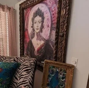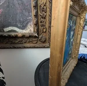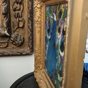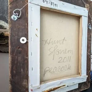 The antique frame has a minor chip on the upper right side which was how it was delivered to me. The artist prefers frames which match the character of his artwork. #huntslonem