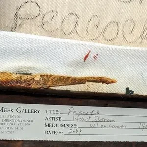 Oil on canvas peacock painting by Hunt Slonem. 11" x 14". Painted 2011.