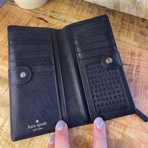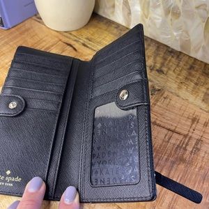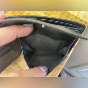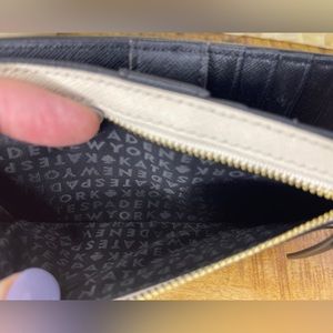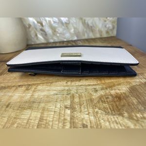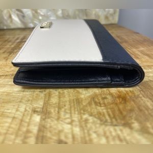 This beautiful Kate Spade wallet is in like new condition. Its color block pattern with black and a light off-white shade. There’s an additional zippered pocket on the exterior. I consider this a medium sized wallet because it’s in between a large zippered wallet and a compact. Please see pics before bidding.
