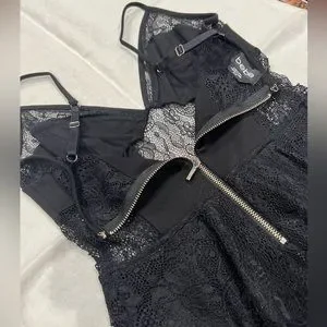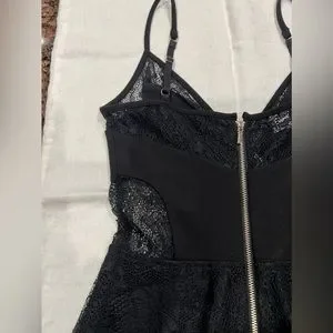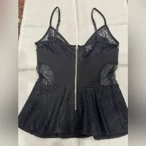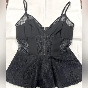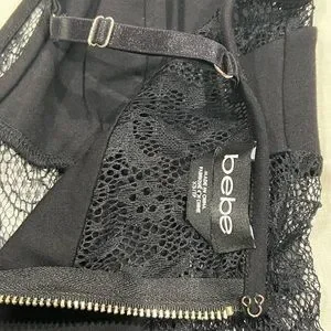 NWOT This gorgeous Bebe lace inset plume tank is absolutely gorgeous. This tank has adjustable thin straps with a gold back zipper. Sz XS