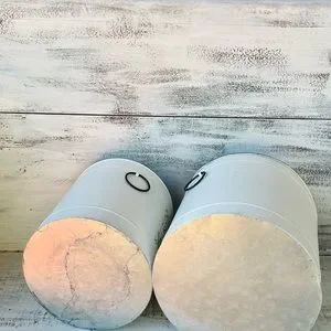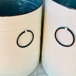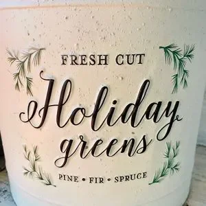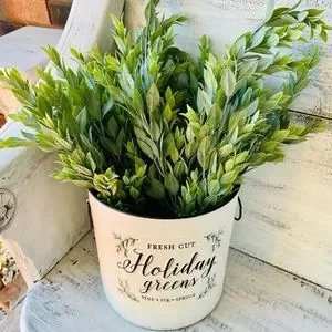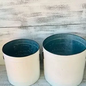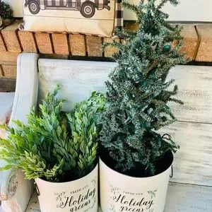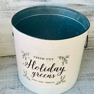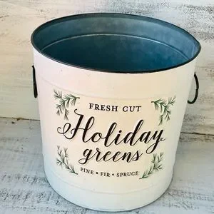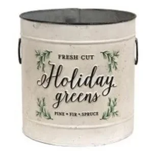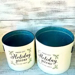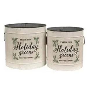 Holiday Greens Distressed Metal Pails sell as a set of two holiday containers. Pails are made of galvanized metal and feature a distressed white finish with black trim for an aged look. Pails have two metal ring handles for carrying and detail and they read, "Fresh Cut Holiday Greens - Pine - Fir - Spruce" in embossed black lettering with embossed pine sprig accents. They look great filled with florals, trees, and assorted knick knacks and measure 8.5" high by 8.5" in diameter; 9.5" high by 10" in diameter. Tree or greenery not included.