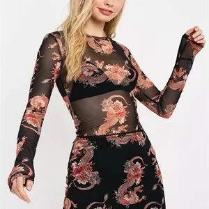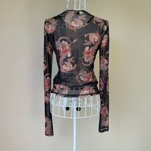 Urban Outfitter UO '90s Dragon Print Mesh Crew Neck Top long sleeve black size M
