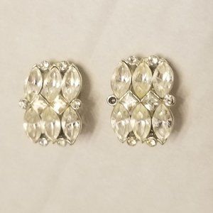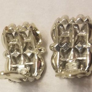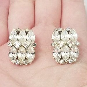 Stunning vintage large silvertone faux diamond clip earrings, signed Kramer. The difference in photo colors is between one room with white lightbulbs and one with yellow. So the yellowed ones are closer to what these would look like in candlelight. The silvertone is in excellent condition. A few of the tiny rhinestones were lost and will need to be replaced, but all the bigger ones are intact and looking great!