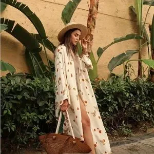 Lightweight bohemian kimono wrap robe with tie. Three-quarter sleeve and full length. Wonderful soft quality polyester, and elastin fabric. One size fits all.