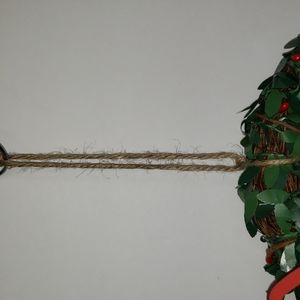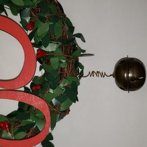 This is a beautiful boxwood wreath that is 8" tall. It has Joy in wood across the front. There is a jingle bell hanging at the bottom. It hangs from a jute loop. The total length from the top of the took to the bottom of the bell is 15.5".