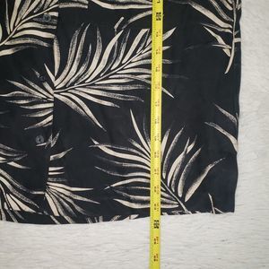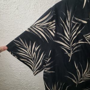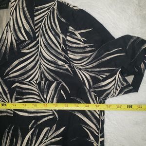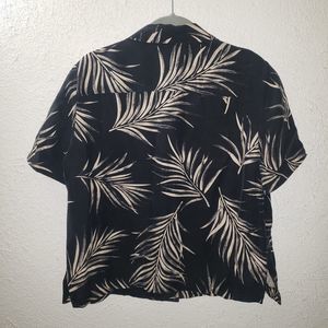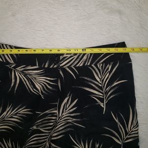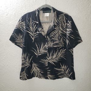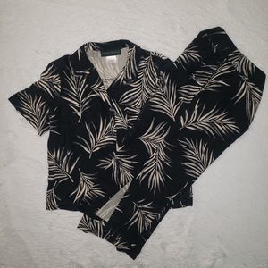 Good pre-owned condition. No holes or stains. 100% silk, really nice feeling to the touch. Black color (or maybe very very dark navy blue) with fern plant pattern all over both shirt and pants. The shirt is a button front, short sleeved, collared blouse. The pants are a chino style front, loose and relaxed, cropped capri pants with a slit at the bottom hem. Women's size 14, true to size. Would fit L or XL, please refer to measurements.