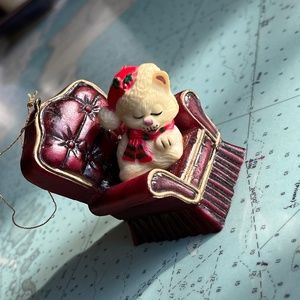 Vintage 1988 Wang's International cat sleeping in chair plastic Christmas ornament. Very good used condition. Measures approx. 2.5" x 2" x 2".