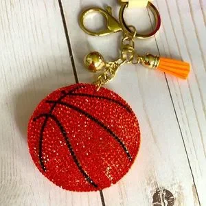 Rhinestone Basketball Keychain. Super cute for your keys or as a decoration for your backpack or gym bag. Great goodie bag stuffer! Front is covered with rhinestones, back is faux leather. Gold tones metal. Key ring, lobster claw hook and tassel. New boutique item with tag.