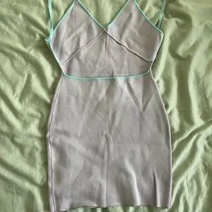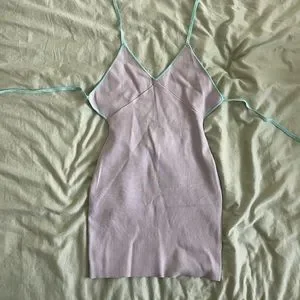 Only worn once, some piling on fabric but since the dress is a light color it’s not very noticeable. Backless, ties around the neck and around the chest.
