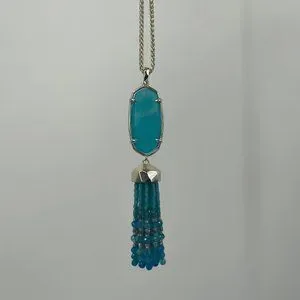 Dazzle like never before with this stunning Kendra Scott necklace! Featuring a stylish hexagonal pendant in a dreamy aqua-toned Howlite stone, this necklace is designed to make a statement. The gold and blue color palette adds the perfect touch of elegance, while the tasseled accent gives it just the right amount of fun. With its 32-inch length, it's just the right size to make a splash at any event, and the slide closure ensures a comfortable fit. This necklace is perfect for year-round wear, making it the ideal accessory for any outfit and every occasion. So why wait? Start turning heads with this Kendra Scott necklace today!
