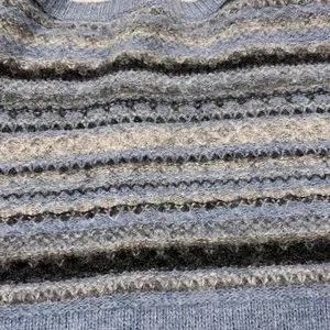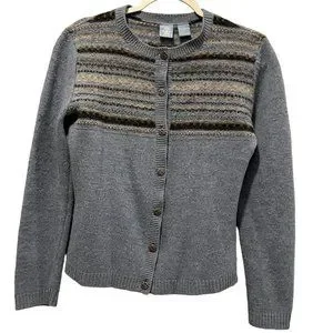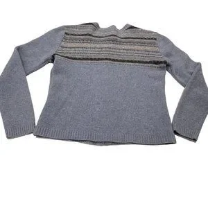 Vintage winter cardigan in shades of blue and gray. Striped accent at top of sweater on front and the back. Beautiful silver buttons. Size Small, fitted style. 100% wool, washable. Excellent condition.