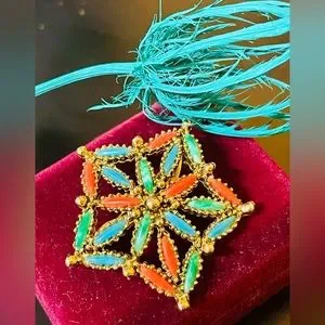 Vintage Five Point Gold Star Brooch. Vintage- Rare Find! Five point star gold tone brooch with turquoise, orange and green inlay design. Great pop of color! No signature or jewelry mark on this brooch. Approximate dimensions: 1 1/4 inch long x 1 1/4 inch wide.