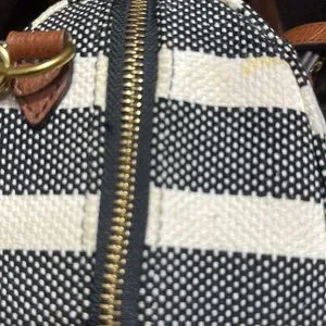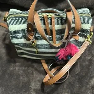 Fossil stripe canvas handbag with crossbody strap included. Brown trim and gold/brass look hardware. Pockets on inside and out. 1 pocket zips on inside. Minor wear, small stains throughout as pictured. Condition, pre-owned.