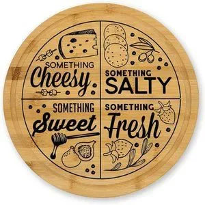 Elevate your dining experience with this versatile serving platform, perfect for presenting an array of cheeses, fruits, and more. It includes helpful food arrangement suggestions conveniently printed directly on the board.