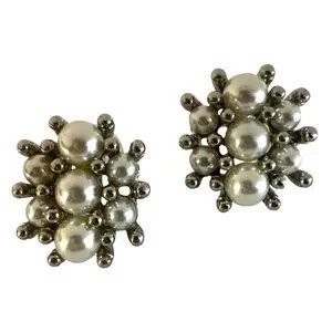 BR Signed White Pearl Cluster Earrings Silvertone Post
