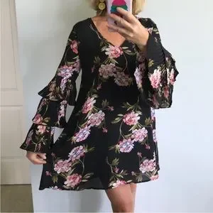 Floral Tiered Bell Sleeve Dress. Gorgeous black with floral design. Long tiered bell sleeves. Lined. Keyhole button at the back of the neck. I am modeling size Small. Fit is true to size. 100% polyester. New boutique item.