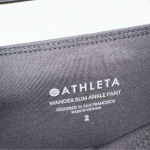 Excellent pre-owned condition with zero signs of wear. Athleta Wander Slim Ankle pants, size 2 in black. Side zipper and zippered pocket on back.