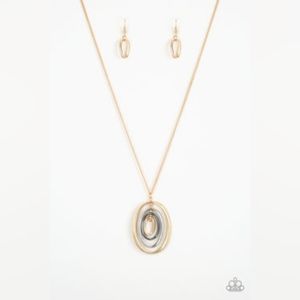 Threaded along a gold-beaded rod, mismatched gold, silver, and gunmetal ovals ripple into a dizzying pendant at the bottom of a lengthened gold chain. Features an adjustable clasp closure.