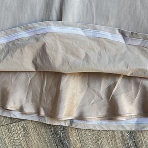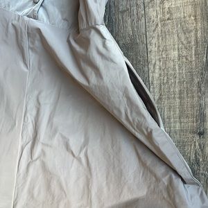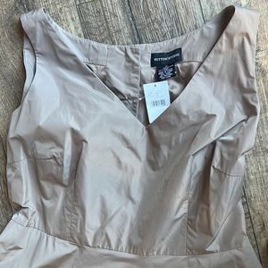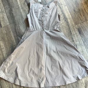So cute! Dark Taupe sleeveless dress. Material has the best feel! Slight hint of sheen. A line shape. Lining under bottom half of dress. Pockets!