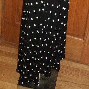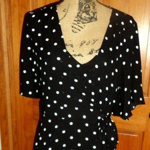 Polka dot surplice dress in black with white · Elbow-length sleeves · Hits below the knee · Curved, high-low hem · Pullover, wrap style, with tie front · Removable slip -- bottom hem edged in lace pattern.