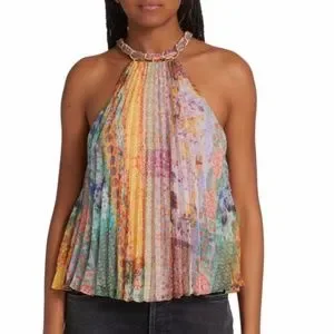 Alice + Olivia's Alycia top is crafted of pleated chiffon with a colorful mixed print. This flowy piece is adorned with a chain-link detail at the neck. Dry Clean only!