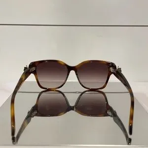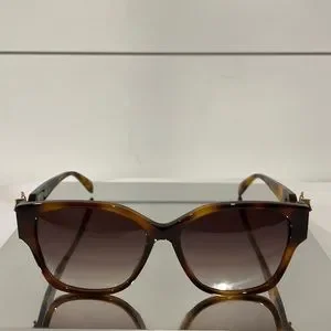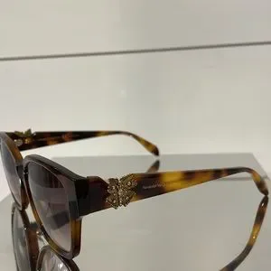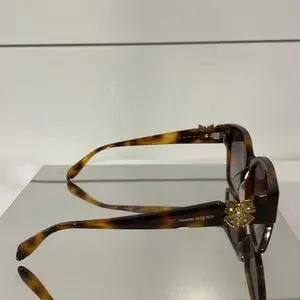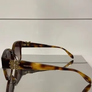 Alexander McQueen logo is lasered on the temples. The color palette includes shiny classic colors for the front and the temples, paired with gradient/solid lenses. The style is refined by butterflies with colored crystals featured on both the temples.