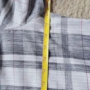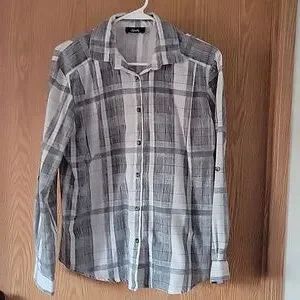 women's Long sleeve top. no tags so not sure what size but think it's a large. black, grey, white and a little red stripes.