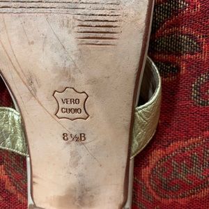 gold leather made in Brazil size 8 1/2 medium. And heels are approximately 2 1/4 inch high.