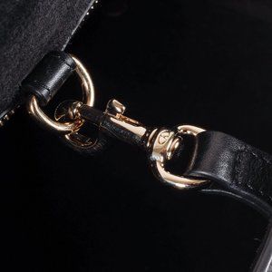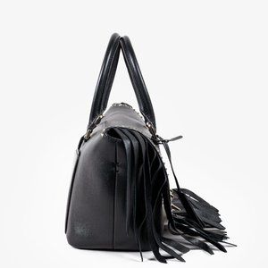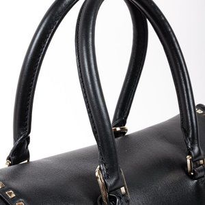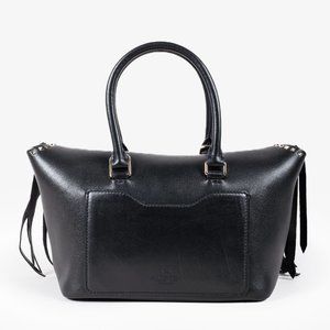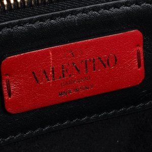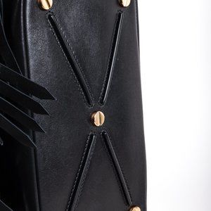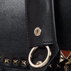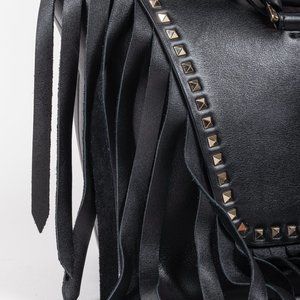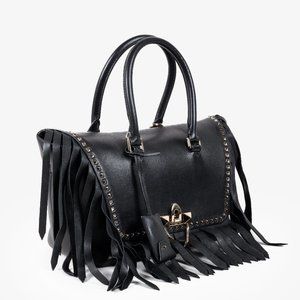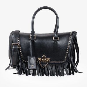 Crafted from smooth leather in black, the Valentino Demilune Flap Satchel features a blond fringe trim around the flap, the signature Rockstuds in light gold hardware, a rear patch pocket, and a pair of rolled leather handles. The flap is secured by a flip lock with a small ornate chain and opens to a spacious suede-lined interior with a zipper pocket, two flat pockets, and a D-ring and lobster claw clasp to attach your keys. This satchel also comes with a leather clochette with a round key ring and an optional shoulder strap.
