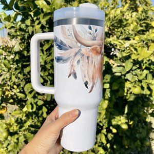 Birthday gift Floral Highland Cow 40 oz Personalized Tumbler. BRAND NEW Double-wall vacuum insulation Tumbler with hand carry handle straw.