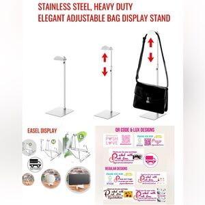 J. Stainless steel adjustable bag stand + 3 easels (small, medium & large) + 60 custom stickers