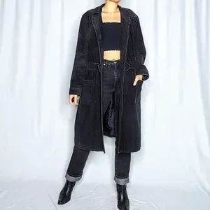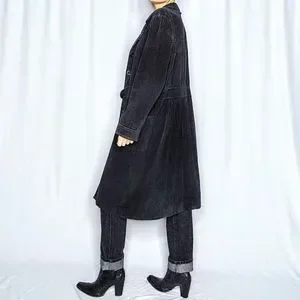 Deep charcoal gray, 100% cotton exterior. 90s era by Willi Smith. Minimalist trench style, fully lined. Very good preloved condition with a bit of light general wear along the edges. Tag size 12 / L. Shown on a 32” bust, 25” waist, 36” hip model.